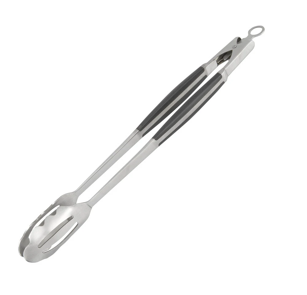 Stylish, high-quality stainless steel utensil featuring full-forged handle made of steel and welded with a black, thermal-resistant material. Contour handle fit comfortably in your hand, and looks great hanging on your grill. The long handles of the tongs ensure you won’t get any nasty burns and the serrated ends ensure a good grip while you easily and effortlessly turn food.