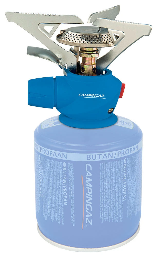 A small backpacking stove from Campingaz with piezo Igintion for ease of lighting. Fits self sealing campigaz CV Cartridges, comes with plastic protective case, so it won’t get to bashed around in the rucksack.