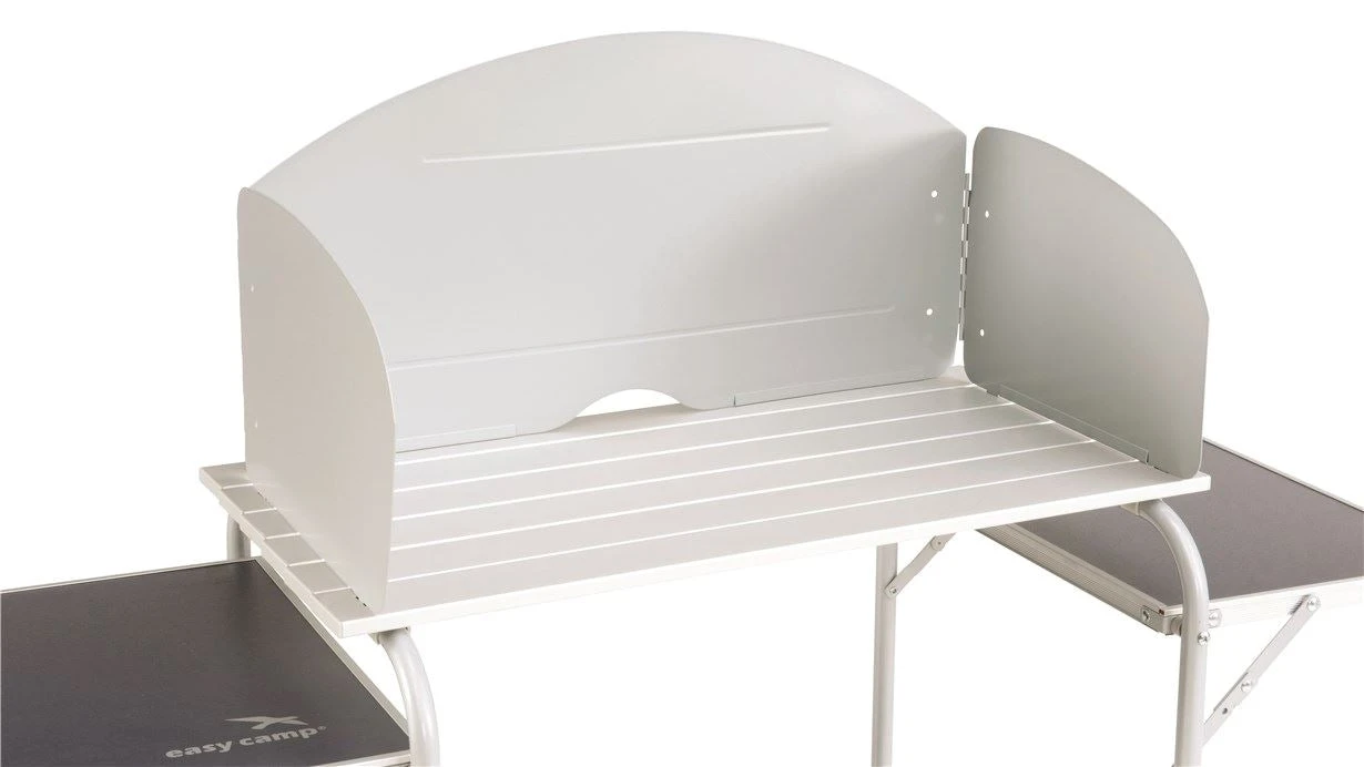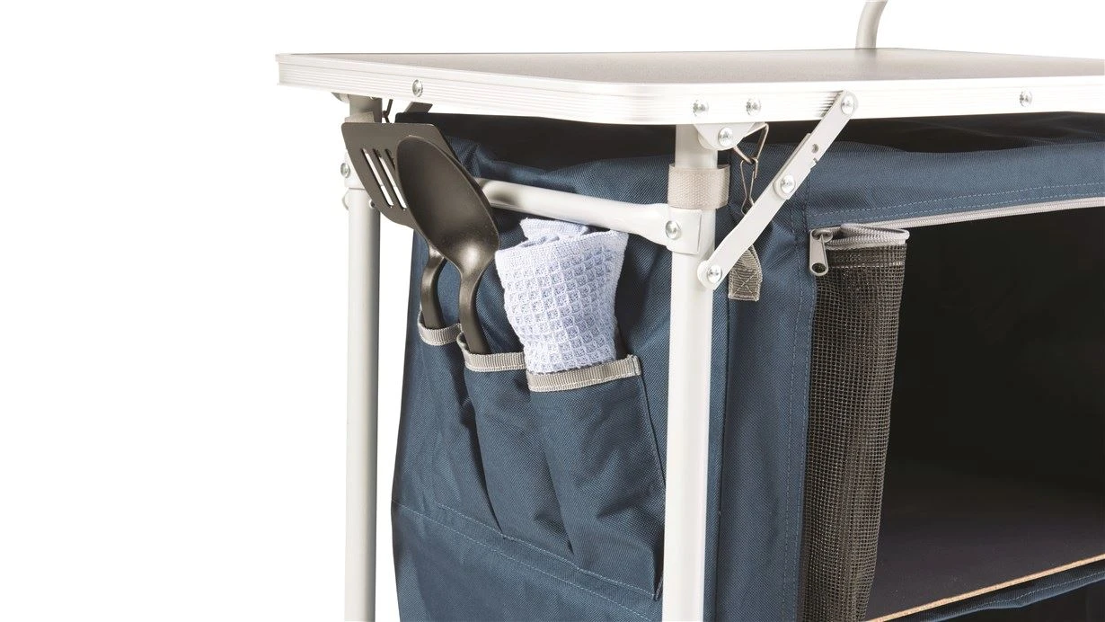 The Easy Camp Sarin is an essential companion for any outdoor adventure. Made with a robust steel frame and 100% Polyester fabric, it’s capable of supporting a weight of up to 30kg. It features an aluminium and laminated roll-up table top, a windshield, two side tables, and organiser pockets. Plus, it includes two fully closed shelves with a mesh door for ventilation. With a foldable steel frame and compact pack size of 50cm x 11.5cm x 78 cm, it’s easy to store and transport. Carry bag included.