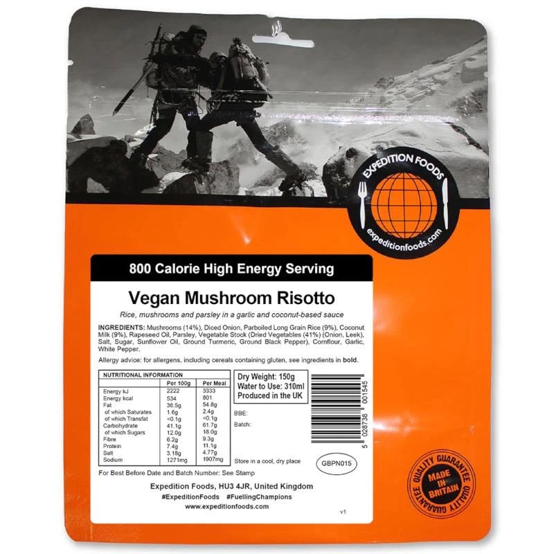 The Vegan Mushroom Risotto by Expedition Foods consists of long grain rice mixed with mushrooms, diced onions, coconut milk, turmeric, leeks and other ingredients. A great High Energy and delicious choice of meal for any diet including vegan, vegetarian and traditional.