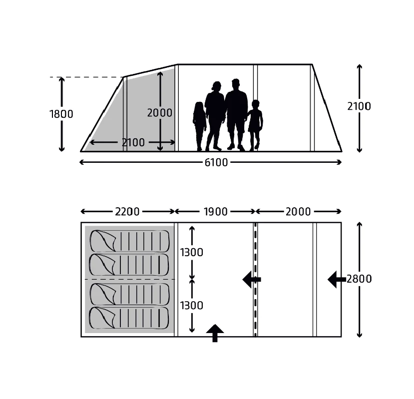 The Hayling 4 Air from Kampa has been a staple of BCH Camping for a good few years now. A classic 4 person inflatable tent, the Hayling 4 is ideal for couples, or for small families. It features a quick 8 minute pitching time with flysheet and inners pitching together. The tent is equipped with Kampa’s own AirFrame inflated beams, and a Weathershield 68D flysheet with a 4,000HH hydrostatic head gives you 100% waterproofing in the worst of weather. Toggle-up curtains offer you privacy, or shade when you desire. Additionally, the tent includes a sewn-in groundsheet and pump. There is a good amount of space inside this tent especially considering it’s only a 4 person. Bedrooms are at the back, next is a spacious living area and then a smaller living area that leads to a generous porch.