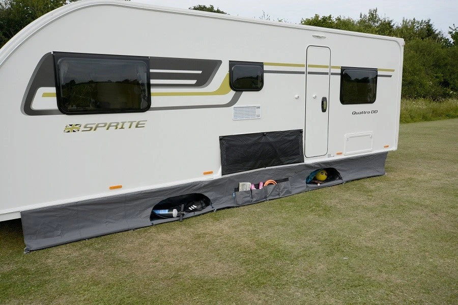Make more of the space under your caravan with this draught skirt organiser. Has two large storage areas and for useful pockets to store your knick knacks. Min length 4m, maximum length 6m. Can easily be cut to the correct length. Drop 60cm.