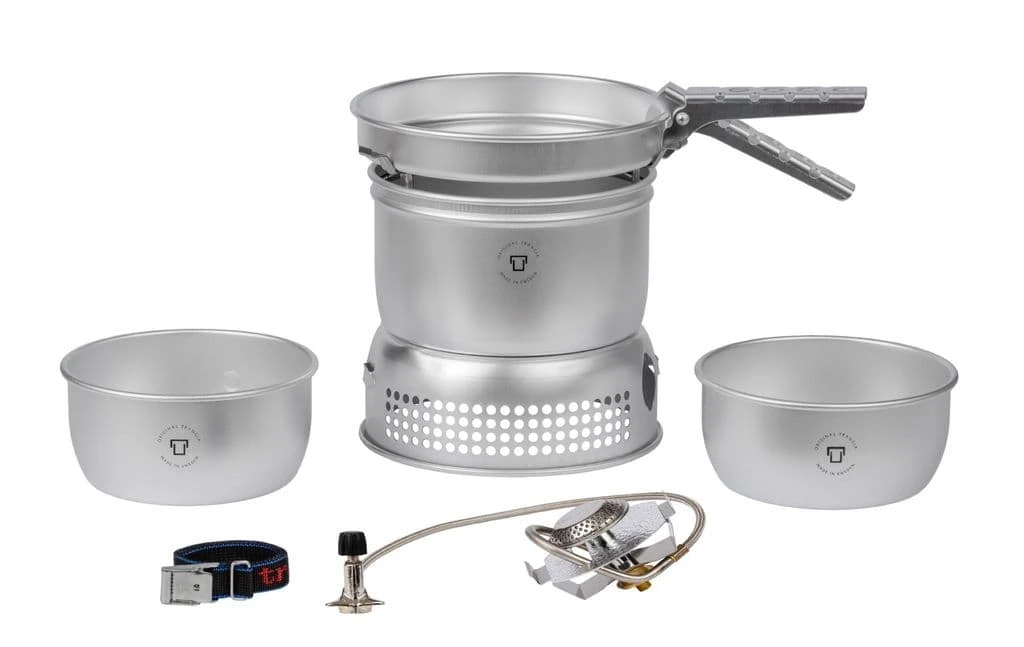 The Trangia 27-1 Inc Gas Burner comes complete with 2 x 1 litre pans,a frying pan, a pan handle, and also a gas burner which runs from most screw threaded cartridges. This stove is ideal for 1-2 persons and packs in to a neat size and comes with a strap to keep it all together.