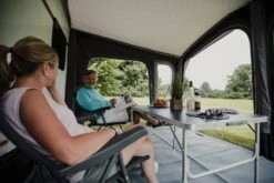 The Riviera Air 390 awning from Vango is a classic shaped inflatable awning that is made using Vango’s Elements Pro Shield fabric which is the toughest, most durable fabric that Vango produce in a touring awning. 100% waterproof and windproof too, the Riviera comes with diamond clear windows as standard, ensuring you have the clearest possible view all around. The Riviera inflates easily from one single inflation point (pump provided) giving you more time to enjoy your well earned holiday. Not only does the single inflation point make the awning quicker to put up, but it also makes it easier and quicker to take down too. Vango’s multi privacy curtains give you privacy whenever you need it, and can be opened or closed multiple ways and distances depending on your requiremants.